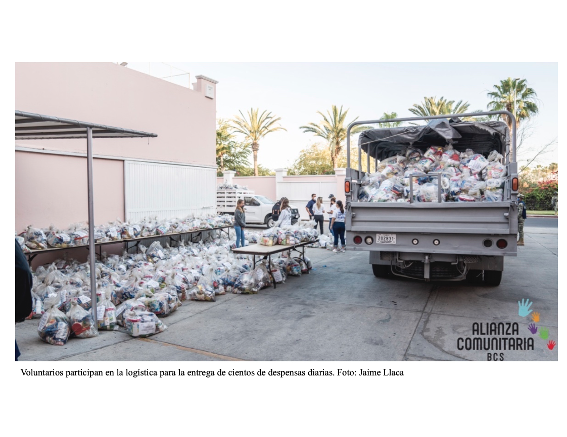 Ruth Ramírez Sánchez, del área de comunicación La Paz de la ACBCS, comenta que para lograr proporcionar ayuda alimentaria a 40 mil familias en BCS durante abril, mayo y junio se requiere no solo de una inversión de $36 millones de pesos mensuales, para comprar las despensas; sino también del trabajo coordinado de voluntarios, miembros de las fuerzas armadas y seguridad pública quienes, tras recibir capacitación en protocolos de bioseguridad para garantizar la distribución y recepción de despensas bajo los más estrictos protocolos sanitarios, van puerta a puerta para realizar las entregas.