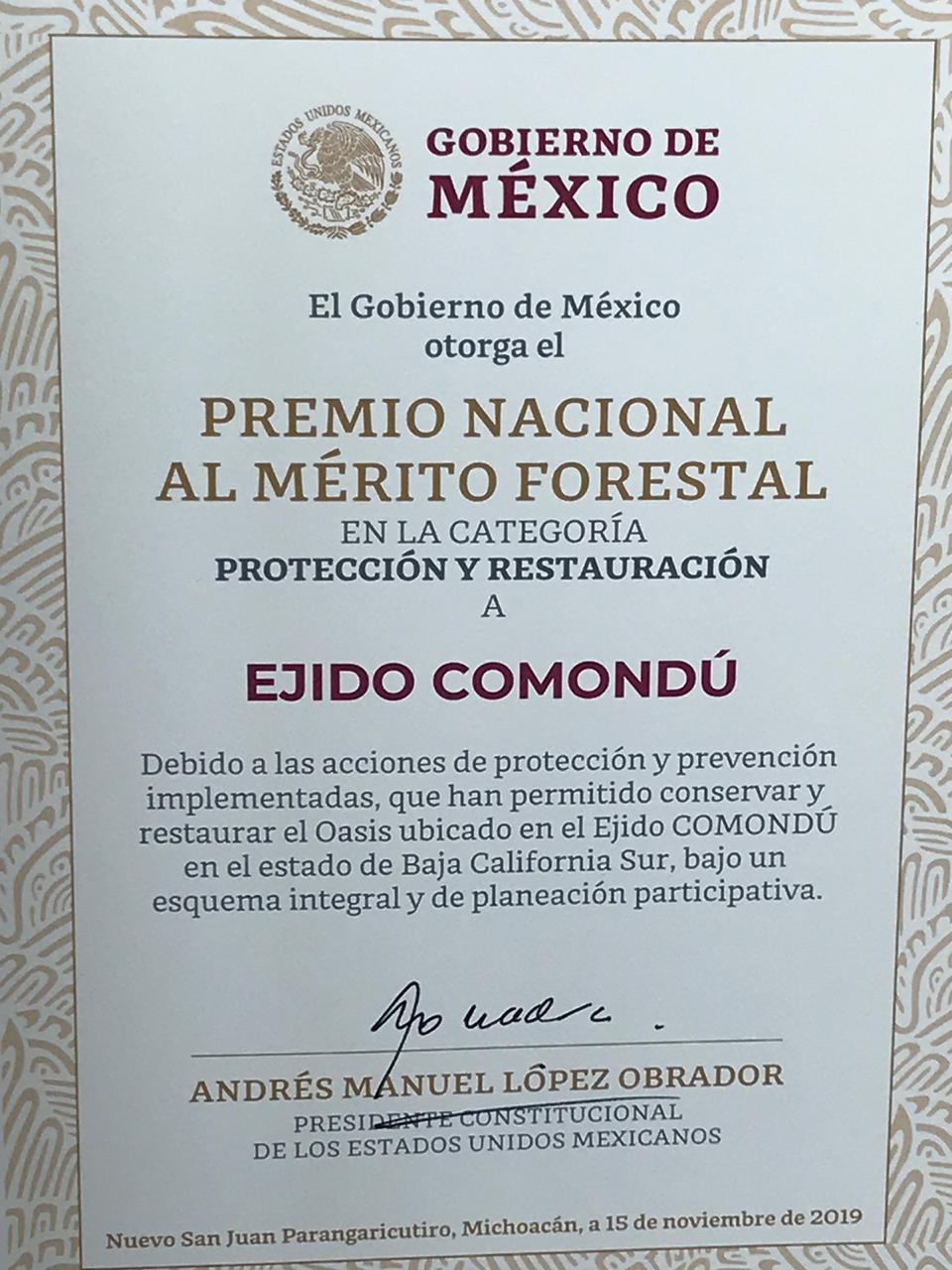 El secretario de Turismo, Economía y Sustentabilidad (SETUES), Luis Humberto Araiza López, hizo entrega del documento oficial firmado por el presidente de la República, Andrés Manuel López Obrador, al Ejido de Comondú, por haber obtenido el Premio Nacional al Mérito Forestal en la categoría de Protección y Restauración; el cual recibió en noviembre del 2019 en Nuevo San Juan Parangaricutiro, Michoacán.