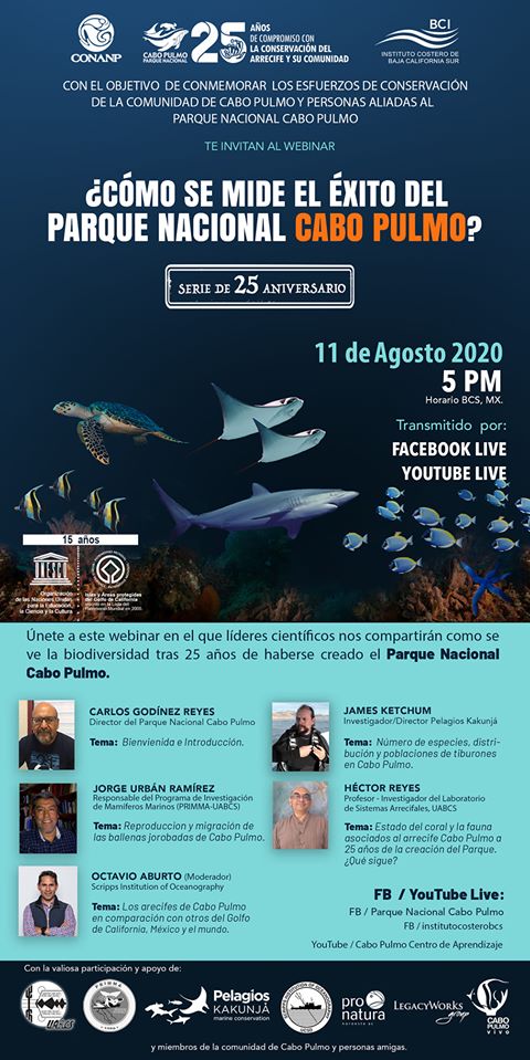 El evento, que forma parte de una serie de conferencias virtuales a celebrarse a lo largo de este mes, es coordinado por instituciones como la Universidad Autónoma de Baja California Sur, Pelagios Kajunjá, Scripps Institution of Oceanography, UC San Diego, Pro Natura, Legacy Works Group; así como grupos de la propia comunidad de Cabo Pulmo.