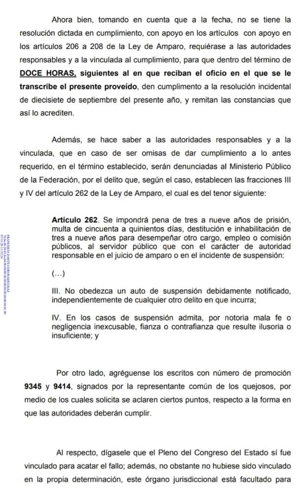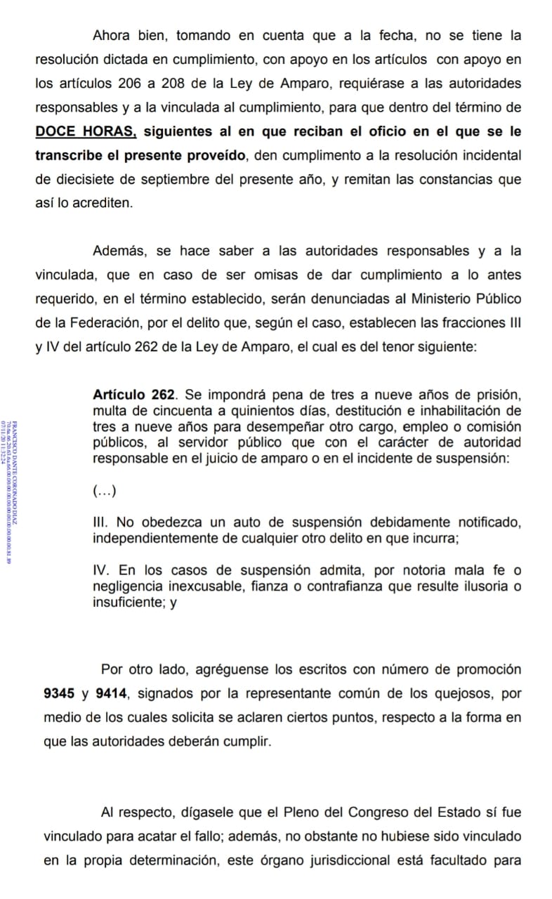 TIENE HASTA LAS 8 DE LA NOCHE DE HOY PARA CUMPLIR CON EL JUZGADO DE DISTRITO