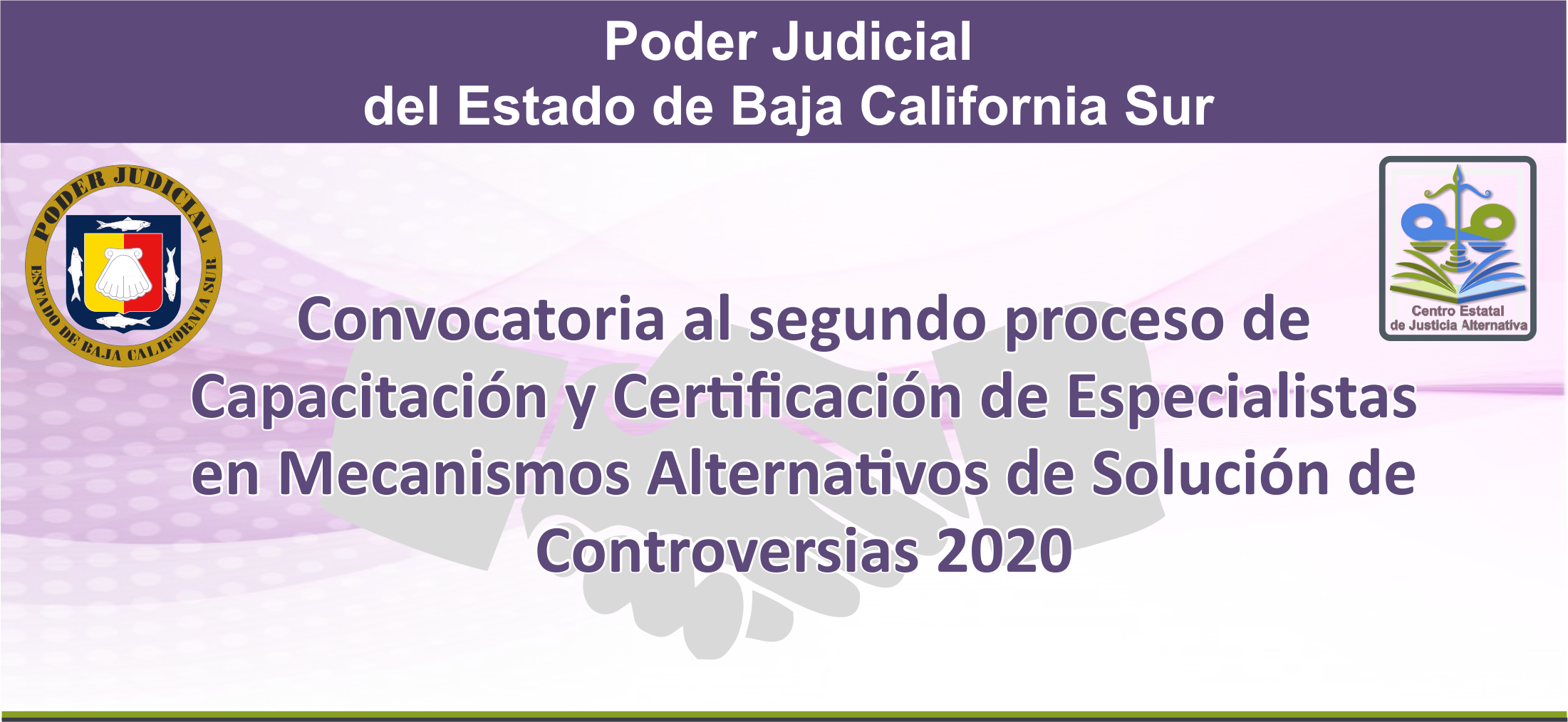 El Poder Judicial del Estado, a través del Consejo de la Judicatura y del Centro Estatal de Justicia Alternativa, convocan a las y los interesados en participar en el segundo proceso de Capacitación y Certificación de Especialistas en Mecanismos Alternativos de Solución de Controversias 2020.