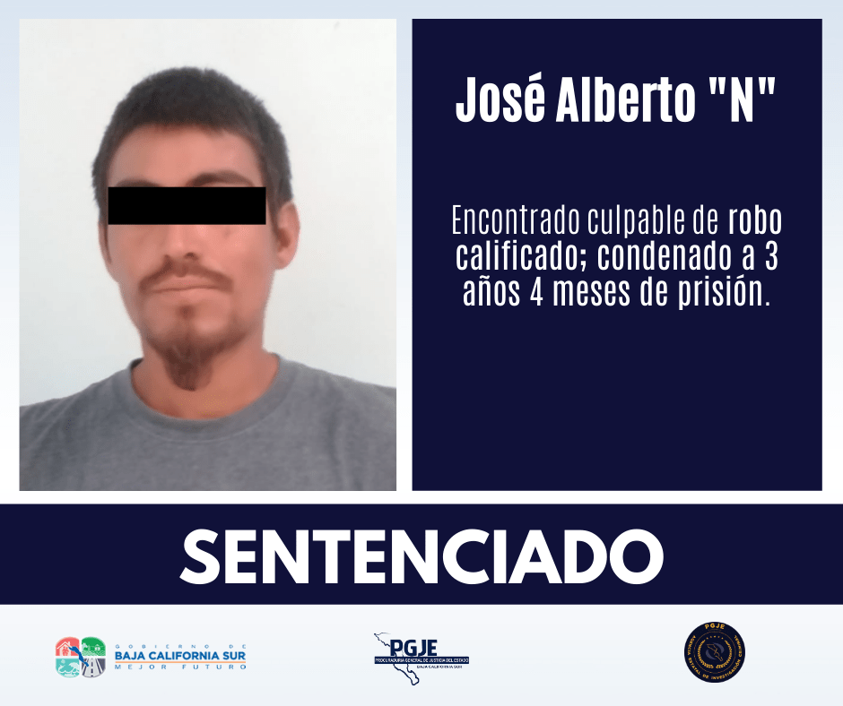 En Audiencia de Procedimiento Abreviado la Procuraduría General de Justicia del Estado (PGJE) acreditó ante un Juez de Control de San José del Cabo, la responsabilidad penal de Aarón “N” y José Ángel “N”, en el delito de robo cometido sobre vehículo motor en grado de tentativa acabada empleando violencia por persona armada, ilícito por el que fueron sentenciados a una pena de tres años seis meses de prisión, la reparación del daño consistente en el pago de 5 mil pesos y el pago de un día de multa.