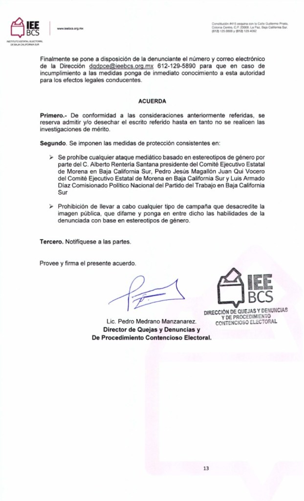 «Se prohibe cualquier ataque mediático basado en estereotipos de género por parte del C. Alberto Rentería Santana presidente del Comité Ejecutivo Estatal de Morena en Baja California Sur, Pedro de Jesús Magallón Juan Qui vocero del Comité Ejecutivo Estatal de Morena en Baja California Sur y Luis Armando Díaz Comisionado Político Nacional del Partido del Trabajo en Baja California Sur».
