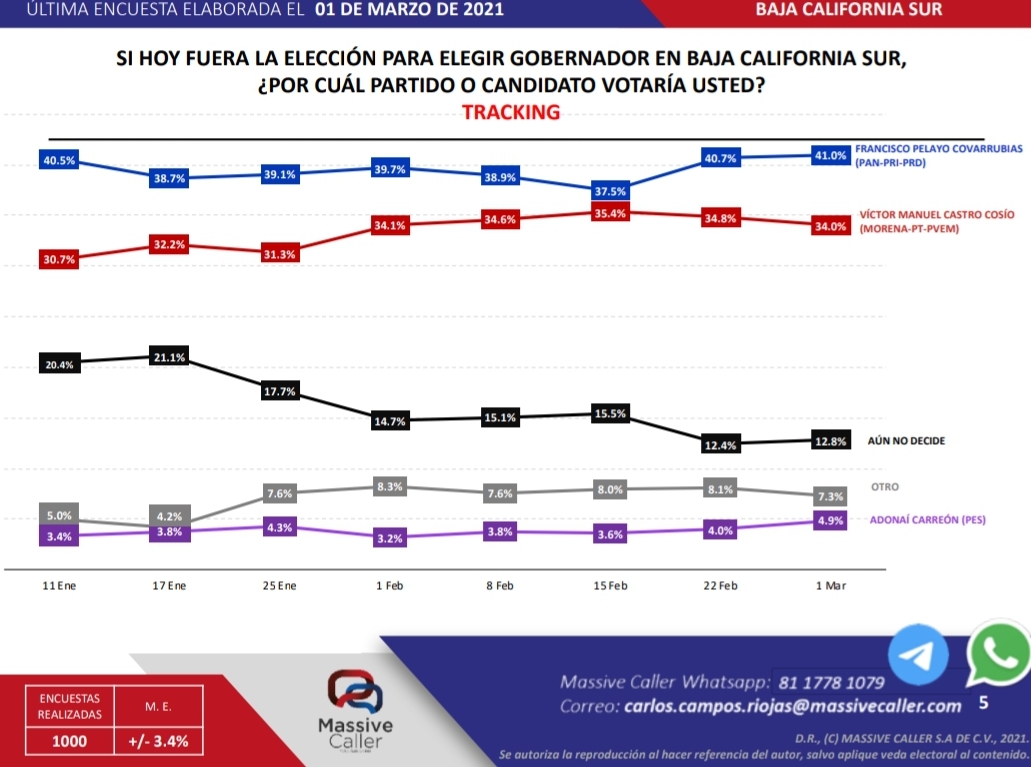 Por el contrario, Francisco Pelayo Covarrubias ha ido subiendo y en la misma medición aventaja con siete puntos porcentuales a Víctor Castro Cosío, quien ha enfrentado dificultades por serios desacuerdos al interior de MORENA, además de la amenaza con un rompimiento en Los Cabos con el Doctor Ernesto Ibarra Montoya y la misma alcaldesa Armida Castro Guzmán.