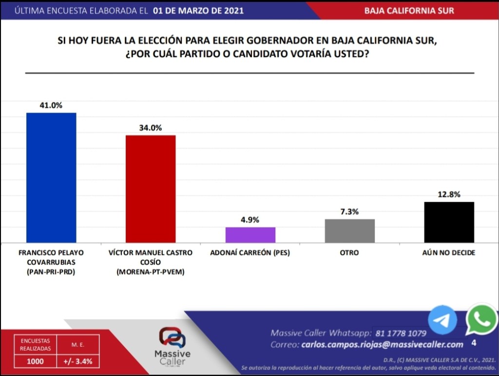 Si las elecciones fuera hoy, el candidato de MORENA PT, profesor Víctor Castro Cosío, perdería con amplio margen, debido a que su más cercano competidor Francisco Pelayo Covarrubias sigue creciendo en las preferencias, de acuerdo al análisis demoscópico de la empresa Massive Caller dado a conocer hoy.