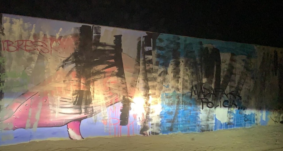 San José del Cabo (California).- Anoche los artistas que ilustran el llamado «muro de la vergüenza» de playa Costa Azul fueron cercados por el operativo conjunto que por la denuncia de «alguien» que les dijo que estaban vandalizando una barda, ordenaron a los jóvenes a que borraran sus manifestaciones con la misma pintura o de lo contrario serían detenidos.