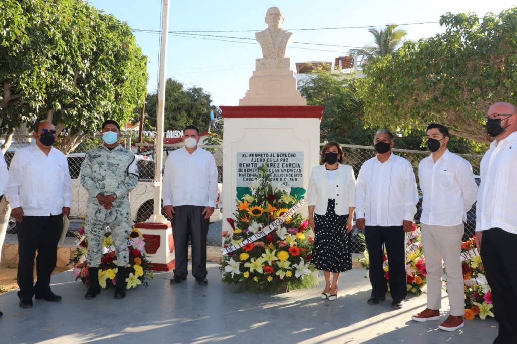 El evento cívico se celebró en la glorieta donde se encuentra el busto de Benito Juárez, en el Centro Histórico de San José del Cabo; ahí, la edil cabeña recordó un poco de la obra del Benemérito de las Américas: «entre los individuos como entre las naciones, el respeto al derecho ajeno, es la paz. Que grande su obra, tanto que en una sola vida pudo transformar la nación de todo un pueblo, de todo México. Hoy estamos, analógicamente en la primavera de la democracia, en la oportunidad histórica de cambiar paradigmas. Yo no estoy sola, estoy gobernando junto a ustedes, con el deseo de alcanzar la paz y la libertad», enfatizó la presidenta municipal.
