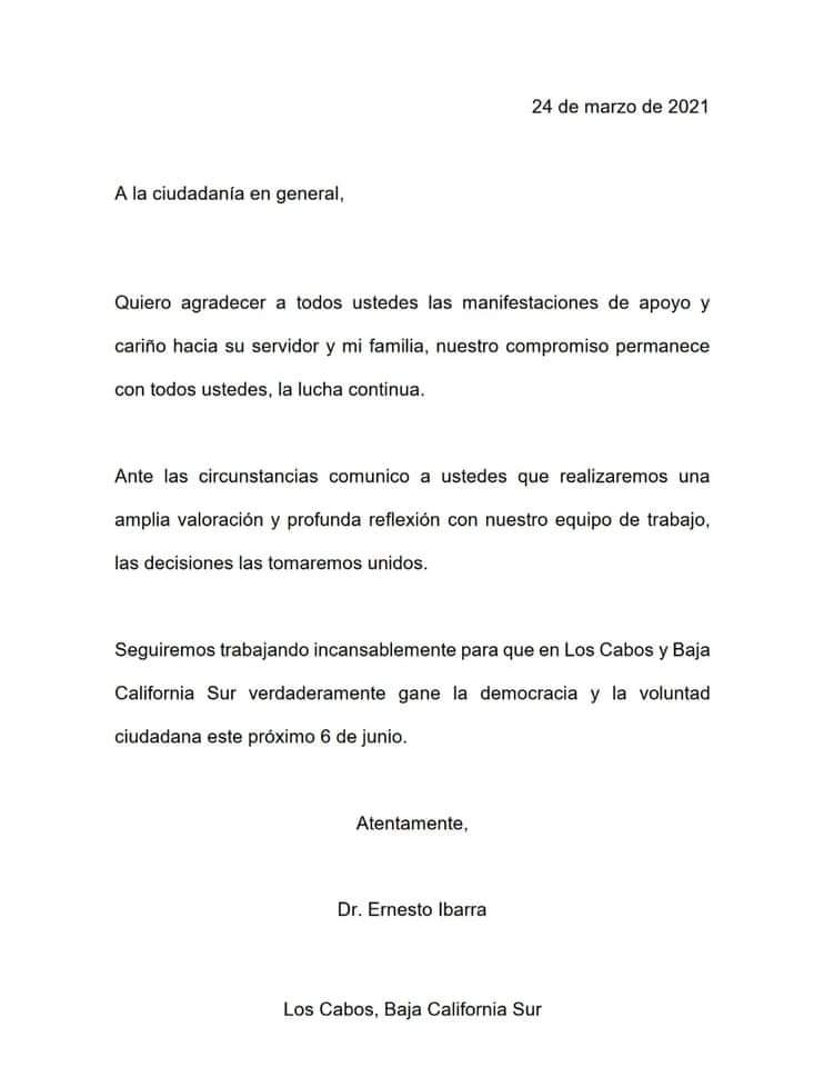En una carta dada a conocer la tarde de hoy, donde no admite su derrota, solamente agradece a sus seguidores y que se va a una valoración y reflexión profunda sobre su derrota.