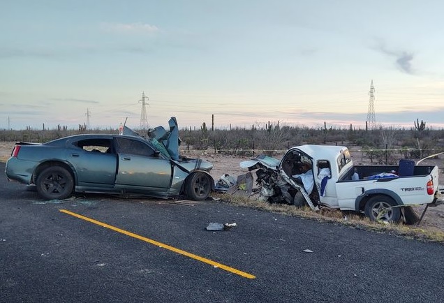 Dos personas fallecidas y dos más lesionadas, uno de ellos un menor de edad, resultado de accidente, tipo choque de frente que se registra esta tarde, en el km. 184.5, tramo carretero Ciudad Constitución-La Paz.