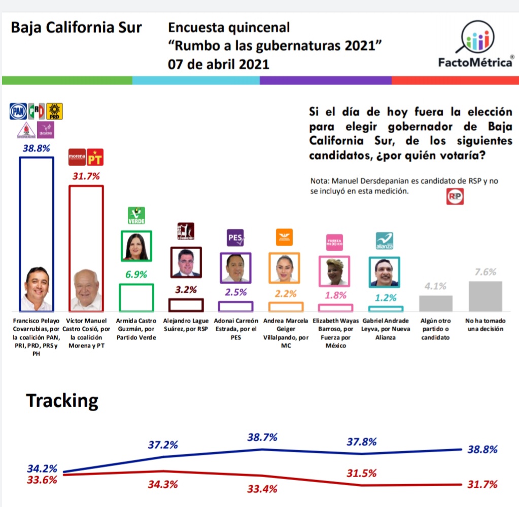 Los dirigentes de los partidos políticos mostraron su beneplácito por la reciente encuesta estatal difundida por la empresa Factométrica, en la que Pancho Pelayo registró una intención de voto del 38.8 por ciento, contra 31.7 por ciento del candidato de Morena y PT, Víctor Castro Cosio.