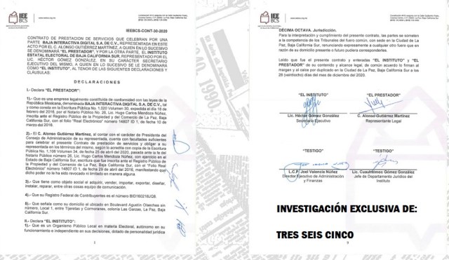 Lo anterior logró conocerse, gracias al reportaje de investigación del periodista Digo Soto, del medio TRES SEIS CINCO, que revela los contratos firmados por el Instituto Estatal Electoral a través del acuerdo IEEBCS-CG30-AGOSTO-2020, para que la empresa Baja Interactiva Digital S.A. de C.V., interconecte sus computadoras con las del IEE, para operar el programa de resultados preliminares.