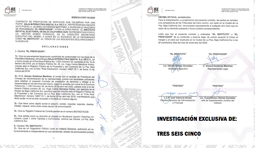 Lo anterior logró conocerse, gracias al reportaje de investigación del periodista Digo Soto, del medio TRES SEIS CINCO, que revela los contratos firmados por el Instituto Estatal Electoral a través del acuerdo IEEBCS-CG30-AGOSTO-2020, para que la empresa Baja Interactiva Digital S.A. de C.V., interconecte sus computadoras con las del IEE, para operar el programa de resultados preliminares.