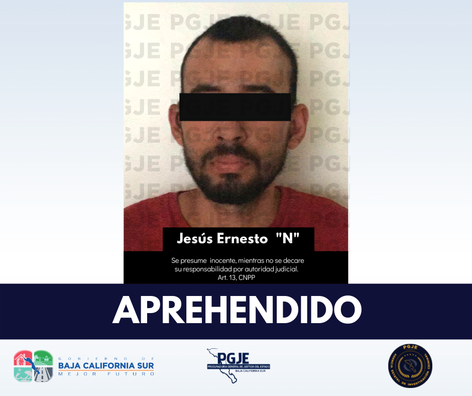 La Procuraduría General de Justicia del Estado (PGJE) informa que este martes 24, agentes de la Agencia Estatal de Investigación Criminal (AEIC), de la Unidad de Mandamientos Judiciales, en coordinación con sus homólogos de la Fiscalía General de Justicia de Baja California, cumplimentaron Orden de Aprehensión que giró el Juez de Control del Partido Judicial de Los Cabos, con residencia en San José del Cabo, en contra de Jesús Ernesto ¨N¨, de 23 años de edad, originario de esta entidad, por su relación en la comisión del delito feminicidio.