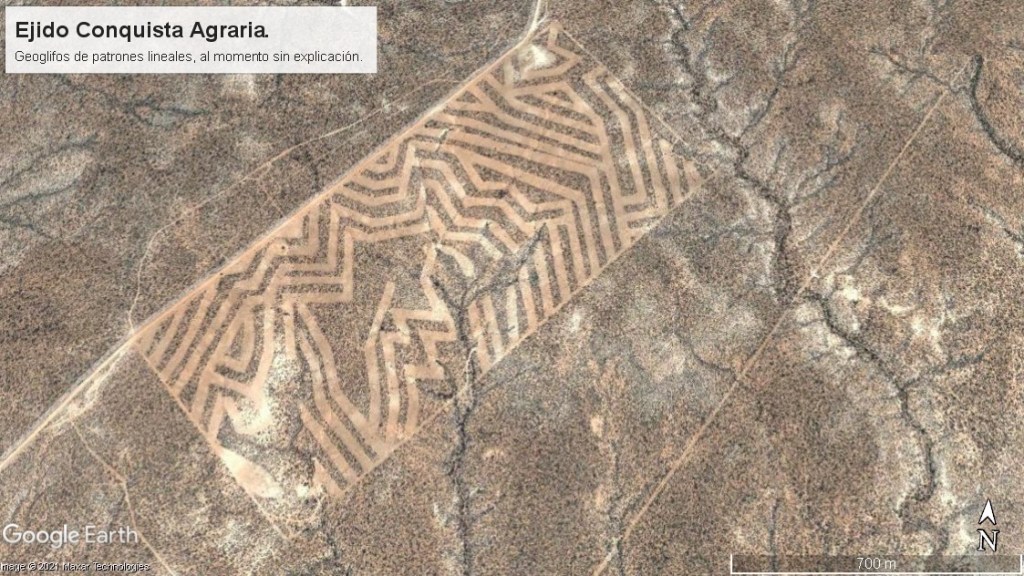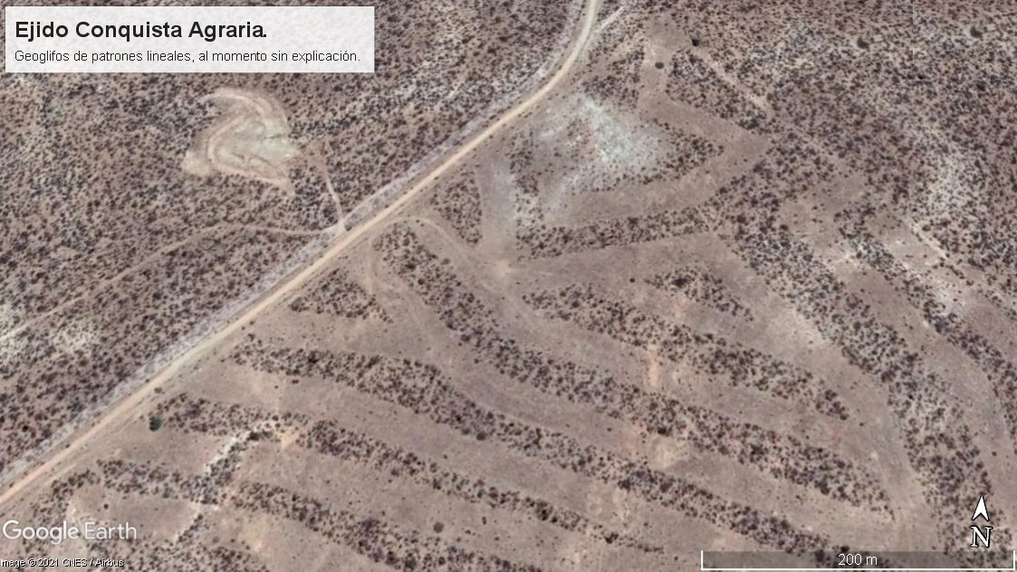 La Paz (California).- Google Earth ha dejado al descubierto una zona ubicada a 4.5 kilómetros del Ejido Conquista Agraria, donde se pueden apreciar lo que parecen ser geoglifos con patrones lineales para lo que, al momento, no existe una explicación lógica.