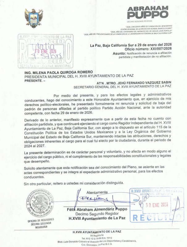 - En La Paz el regidor Abraham Puppo, renuncia a su militancia al PAN. Se desmorona la pusilánime dirigencia de Rigo Mares.