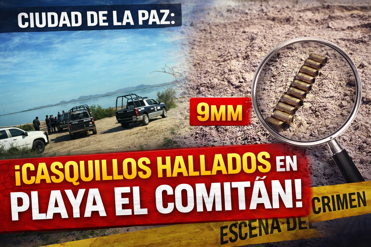 La Paz (California) — Una investigación fue abierta tras el hallazgo de cerca de 40 casquillos percutidos calibre 9 milímetros en las inmediaciones de la playa El Comitán, en la ciudad de La Paz. Los indicios fueron localizados durante un rastreo realizado en la zona costera, luego de que se reportara la presencia de objetos metálicos dispersos sobre la arena.
