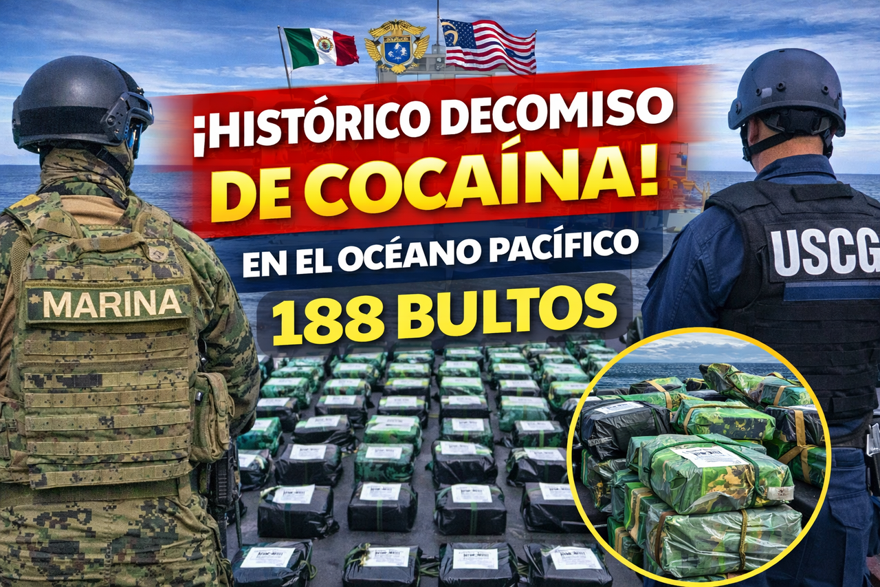 La Paz (California) — En una operación marítima de alto impacto realizada en aguas internacionales del Océano Pacífico, fuerzas navales de México y Estados Unidos lograron el aseguramiento de aproximadamente 188 bultos que contienen varias toneladas de presunta cocaína, en uno de los decomisos más relevantes recientes en la región.