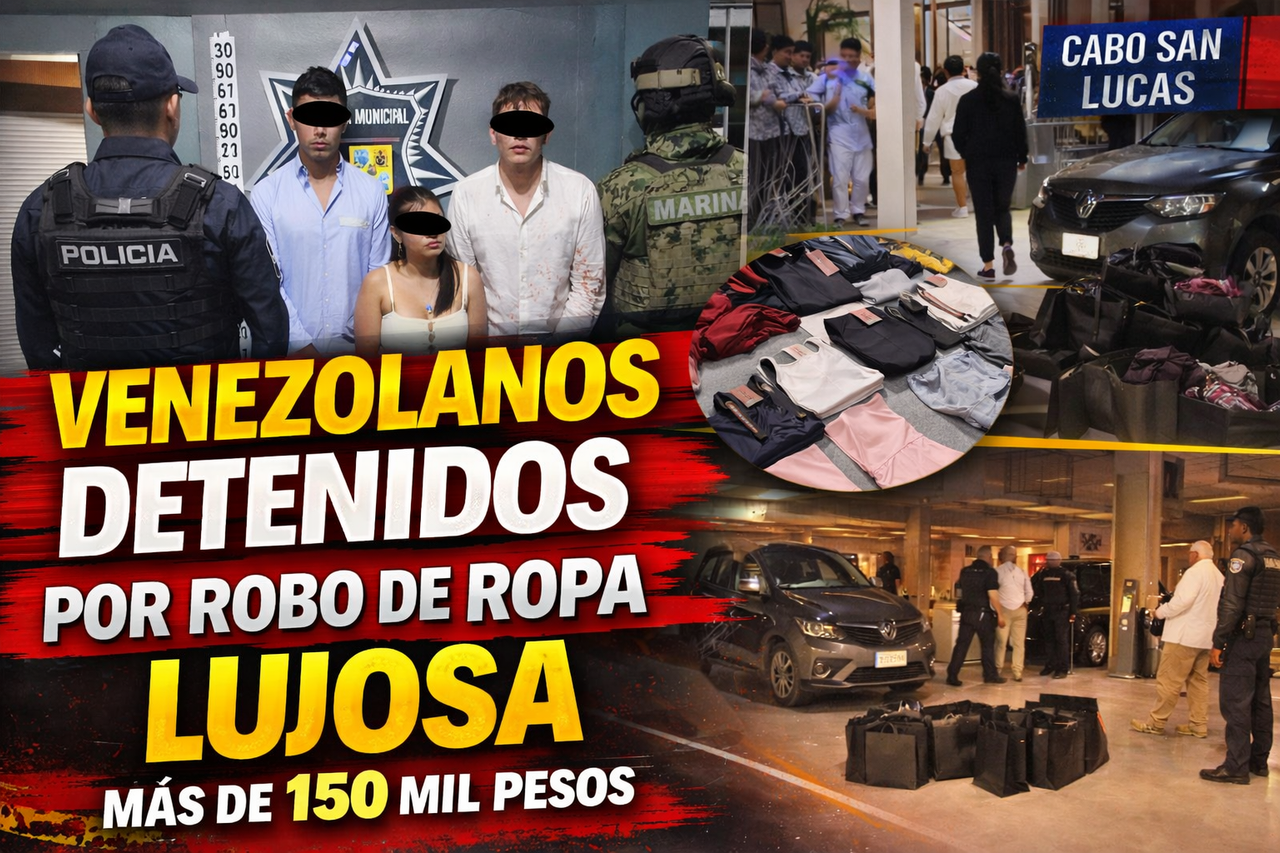 Cabo San Lucas (California) — Tres personas de nacionalidad venezolana —dos hombres y una mujer— fueron detenidas la noche del domingo en Cabo San Lucas, luego de ser sorprendidas presuntamente sustrayendo prendas de alta gama de una tienda ubicada dentro de la plaza comercial Ánima Village, en la zona turística de Cabo del Sol. El valor estimado de la mercancía recuperada supera los 150 mil pesos.