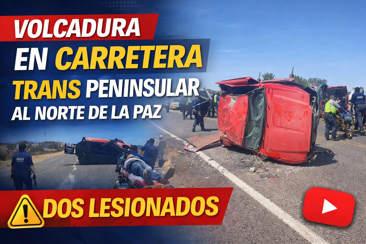 La Paz (California) — Dos hombres resultaron lesionados luego de que una camioneta volcara la tarde del sábado 14 de marzo sobre la carretera Transpeninsular, a la altura del kilómetro 25, al norte de la ciudad de La Paz. El hecho fue reportado alrededor de las 14:00 horas a través del sistema de emergencias C4, donde se alertó a las autoridades sobre un accidente vehicular en esa vialidad.