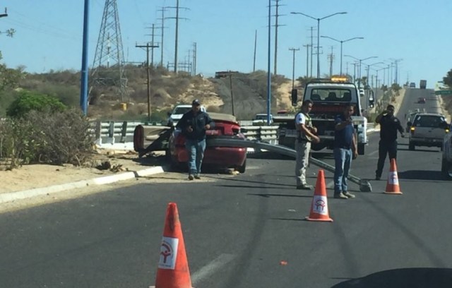 San José del Cabo (California).- El conductor de un FORD Mustang perdió el control de la unidad minutos antes de las 9 de la mañana de hoy, para chocar contra el barandal de protección del Puente Arroyo Los Limones, en la carretera federal en dirección al aeropuerto internacional de Los Cabos.