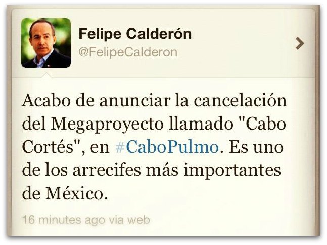 El Centro Mexicano de Derecho Ambiental, A.C. (CEMDA) se congratula por el anuncio hecho el día de hoy por parte del titular del ejecutivo federal, Felipe Calderón Hinojosa, en el sentido de cancelar de manera definitiva el proyecto Cabo Cortés, contiguo a la reserva marina de Cabo Pulmo en los Cabos, Baja California Sur.