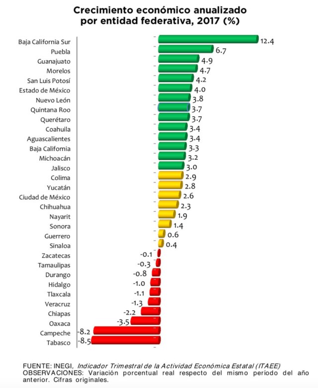 Lo anterior de acuerdo con las mediciones publicadas recientemente por el Instituto Nacional de Estadística y Geografía -INEGI-, las cuales indican un avance del 21.4% del PIB estatal en este primer trimestre -2018- con respecto al mismo periodo de 2017.