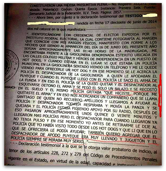 En el expediente del homicidio del joven de 19 años de edad, filtrado en internet, informan que según las pruebas realizadas de Rodizonato de Sodio al muerto, le fue identificada la presencia, en ambas manos y brazos, de “residuos de plomo, por arma de fuego”.