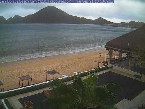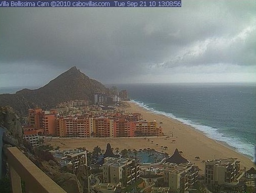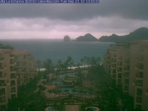 Algunas fotografías de hace unos minutos en Cabo San Lucas, donde los vientos son ligeros, no hay oleaje violento y lluvias intermitentes con nublados intensos. Estos son los efectos de la tormenta tropical Georgette que se encuentra a solo 10 kilómetros de este lugar, con dirección noroeste a 15 km/h.