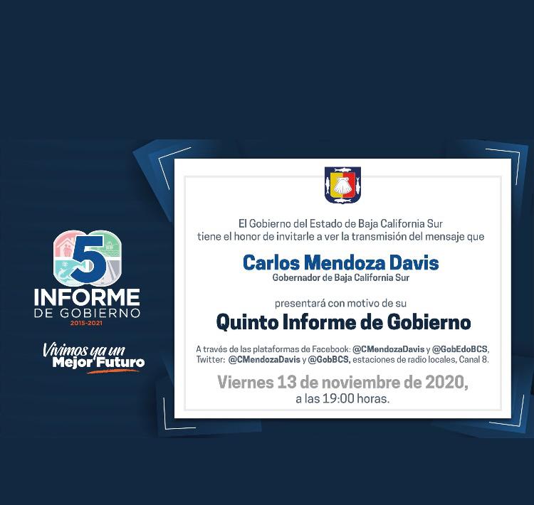 Anoche cumpliendo con lo que ordena la Constitución local y federal, el gobernador de BCS, Carlos Mendoza presentó su ‘Quinto Informe de labores’ de manera muy diferente a los otros cuatro realizados en 2016, 2017, 2018 y en 2019, mismos que con gran protocolo tuvieron como escenario el Teatro de la Ciudad con representativos de la población e invitados especiales, así como ‘un representante presidencial (el año pasado al 4º Informe, fue el Secretario de Turismo, quien asistió en representación de AMLO), ya que esta vez ‘por la pandemia’, fue a través de redes sociales y radio y Tv oficiales, haga clic aquí: https://youtu.be/VlgNPlCawoE