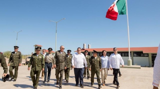 Acudimos a Loreto atendiendo una invitación oficial con motivo de la visita del Secretario de la Defensa, General Salvador Cienfuegos, para inaugurar las nuevas instalaciones militares en ese puerto, que se construyeron con el apoyo del gobierno de BCS: un cuartel con dos grandes dormitorios y baños para 62 elementos en total; junto al Aeropuerto, en terrenos que la SEDENA tiene hace tiempo, con una inversión de 15 millones de pesos, según comentó el Gobernador Carlos Mendoza, subrayando ‘el papel estratégico’ que las fuerzas armadas y concretamente de SEDENA realizan en ese lugar, para coadyuvar en seguridad en esa zona.