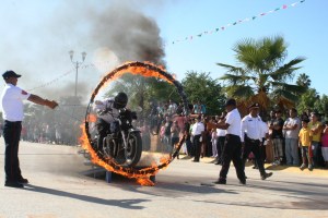 Aro de fuego: un agente de tránsito salta a través de un aro de 2 metros de circunferencia envuelto en llamas, lo que le limita el grado de maniobra, aumentando el grado de dificultad y riesgo.