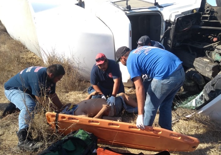 La Paz (California).- Procedente de Cabo San Lucas y en la recta de El Carrizal a la altura del kilómetro 18, un trailero que transportaba góndolas con cemento, se quedó dormido al volante y se salió de la carretera hoy al amanecer.